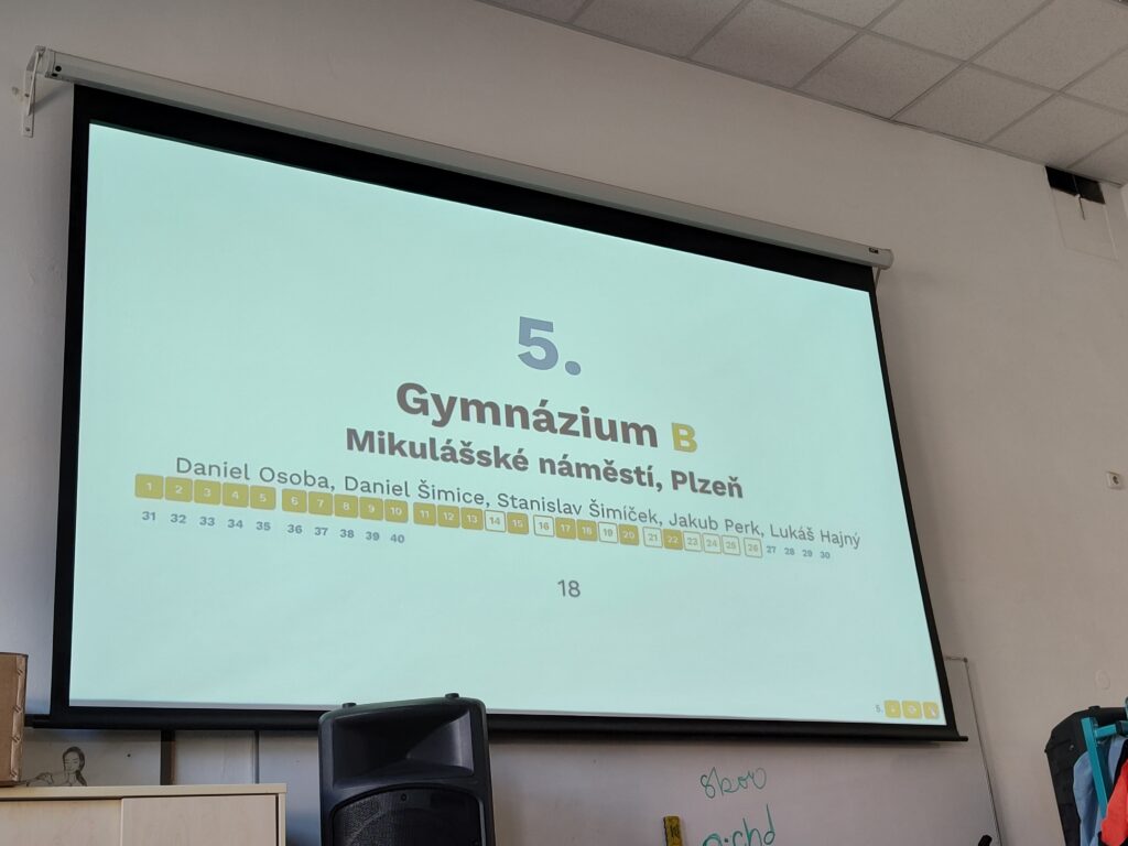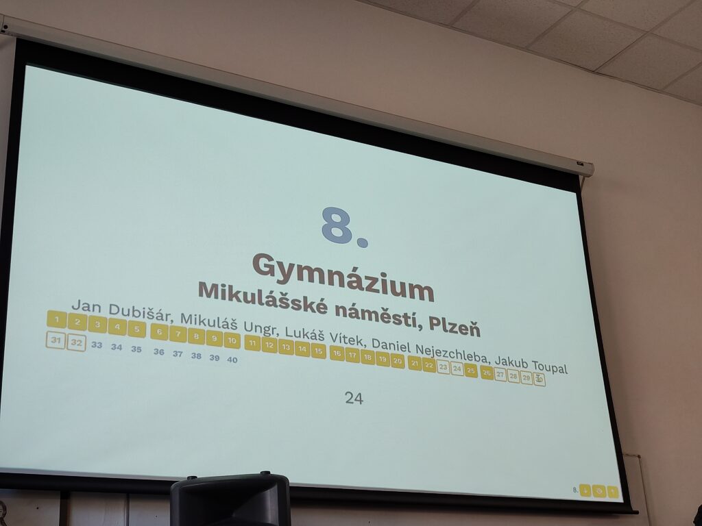 Juniorské týmy byly rovněž úspěšné, ačkoliv příští roky na ně čekají jistě slibnější příčky. Reprezentace 5.E ve složení Lukáš Hajný, Daniel Osoba, Jakub Perk, Daniel Šimice a Stanislav Šimíček se celorepublikově umístila 28. Druhý juniorský tým ve složení Barbora Bíklová (6.E), Matyáš Kliment (5.F), Johanka Pouchová (5.F), Hana Roloffová (5.F) a Filip Roth (5.F) získal v Praze nádherné páté místo, celorepublikově skončili osmí a mezinárodně osmadvacátí.
