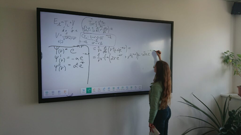 Druhým bylo kvantové Monte Carlo. Monte Carlo je algoritmus s téměř univerzálním užitím. Má uplatnění ve finančním sektoru, chemii a v mnoha dalších oblastech. Ve výukovém materiálu jsem nejprve ukázala, jak se pomocí něj dá vypočítat číslo pí. Dále jsem počítala základní energetický (tedy nejnižší) stav atomu vodíku. Výpočet jsem provedla kvantově (pomocí Variational Quantum Eigensolver (VQE)) i klasicky. Výsledky jsem porovnávala. Krom zrychlení nabízela kvantová verze i menší statistickou chybu.“