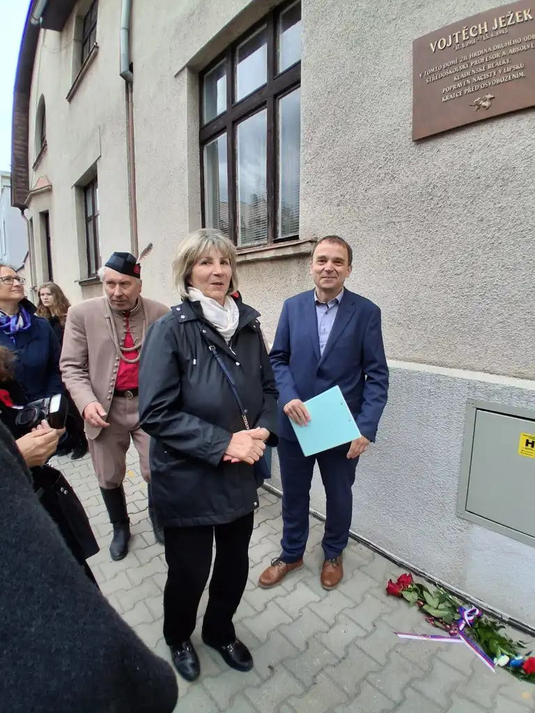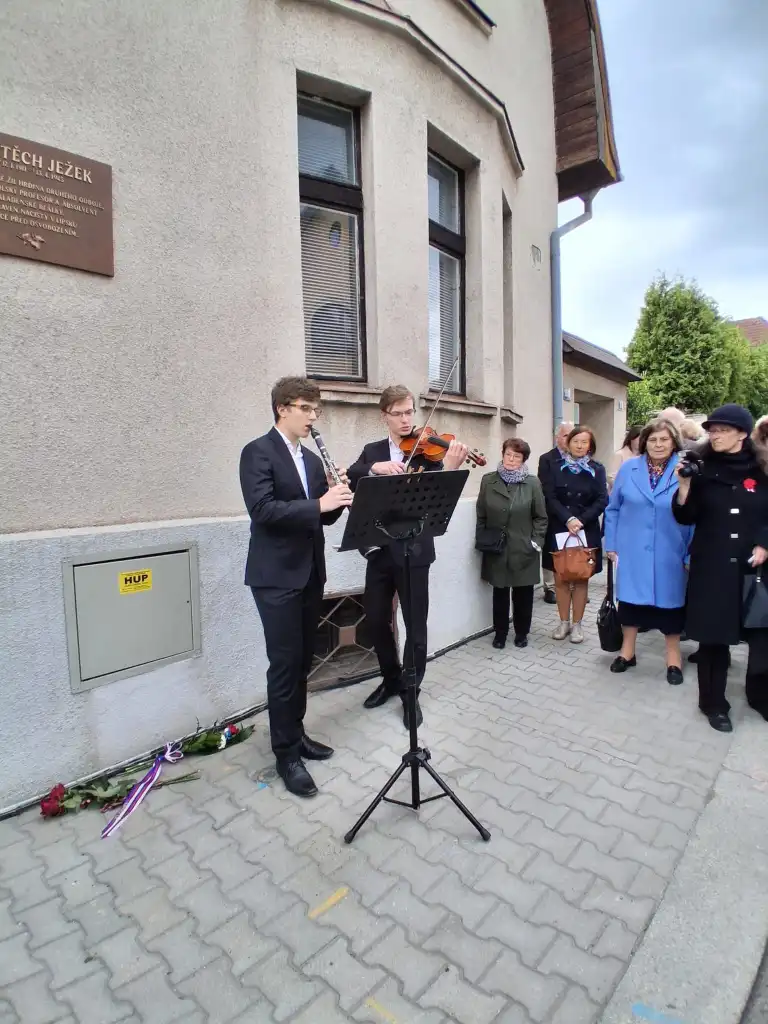 Letošní 80. výročí osvobození naší země od německé okupace bylo spojeno s celou řadou vzpomínkových akcí. Jedna z nich se odehrála 5. května v Kladně u rodného domu Vojtěcha Ježka – hrdiny druhého odboje, bývalého profesora na dnešním Gymnáziu Plzeň a ředitele této školy in memoriam. Pietního aktu se zúčastnila řada členů rodiny Vojtěcha Ježka a také zástupci naší školy.